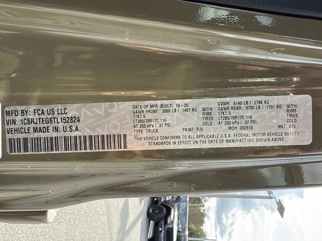 Price includes: $1000 - 2026 National Select Inventory Bonus Cash. Exp. 01/04/2027 Army Green 2026 Jeep Gladiator Mojave 4WD 8-Speed Automatic 3.6L V6 24V VVT Alpine Premium Audio System, Auto High Beam Headlamp Control, Auto-Dimming Rear-View Mirror, Blind Spot & Cross Path Detection, Bluetooth® Wireless Speaker, Body Color 3-Piece Hard Top, Body Color Rubicon Highline Flare, Freedom Panel Storage Bag, Full Length Floor Console Premium Armrest, Heated Front Seats, Heated Steering Wheel, Integrated Off-Road Camera, Integrated Voice Command w/Bluetooth®, Leather Trimmed Bucket Seats, Leather Wrapped Park Brake Handle, Leather Wrapped Shift Knob, Mojave Top Hood Decal, MOPAR Hardtop Headliner, ParkSense Rear Park Assist System, Power 4-Way Driver Lumbar Adjust, Power 4-Way Passenger Lumbar Adjust, Power Adjust 8-Way Driver Seat, Power Adjust 8-Way Front Passenger Seat, Premium Door Trim Panel, Quick Order Package 24A Mojave X, Radio: Uconnect 5 Nav w/12.3 Display, Rear Armrest w/Cupholder Seat, Rear Sliding Window, Rear Window Defroster, Steel Front Bumper, Steel Rear Bumper, Universal Garage Door Opener, USB Host Flip.