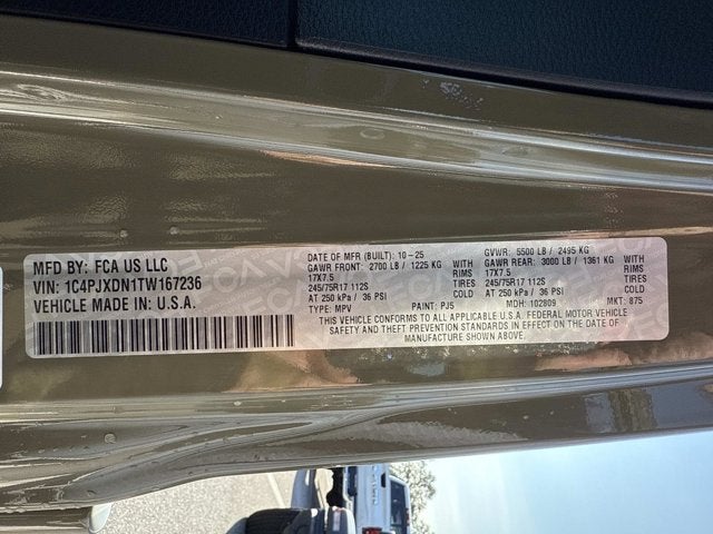 Price includes: $1500 - 2026 National Select Inventory Bonus Cash . Exp. 01/04/2027 Army Green 2026 Jeep Wrangler Sport 4WD 8-Speed Automatic 2.0L I4 DOHC 4-Wheel Disc Brakes, ABS brakes, Air Conditioning, Brake assist, Electronic Stability Control, Normal Duty Suspension, ParkView Rear Back-Up Camera, Power windows, Quick Order Package 22B Sport, Radio: Uconnect 5 w/12.3 Display, Remote keyless entry, Speed control, Steering wheel mounted audio controls, Traction control.